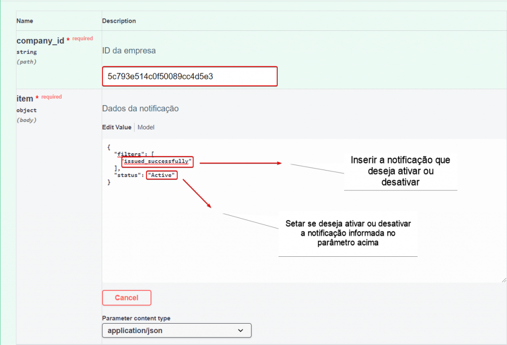 Para desativar uma notificação o json ficará com o seguinte formato:
