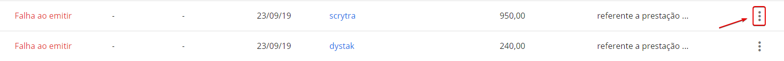 Na página de listagem das notas basta clicar no menu de opções, exibido no canto direito da tela na mesma linha que exibe a NFS-e rejeitada (nos 3 pontos na vertical).
