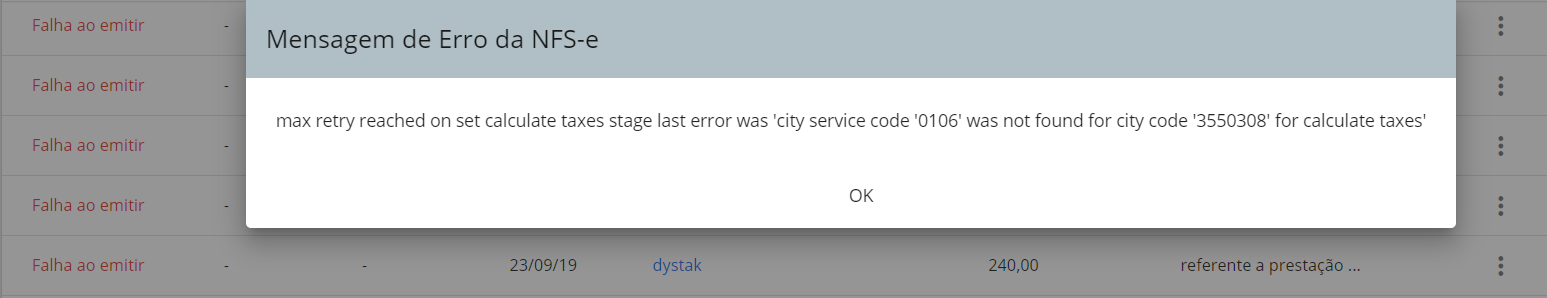 Será aberto um popup exibindo uma mensagem com a descrição da rejeição.