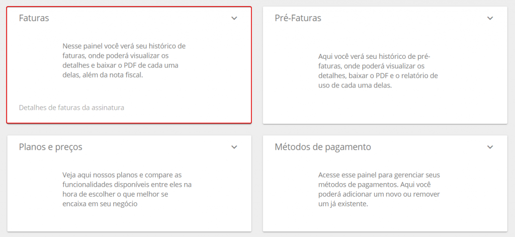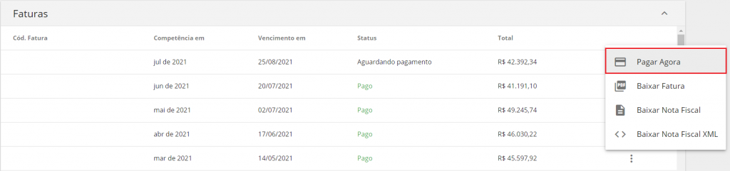 Na próxima tela será possível visualizar todas as suas faturas pagas e pendentes de pagamento.