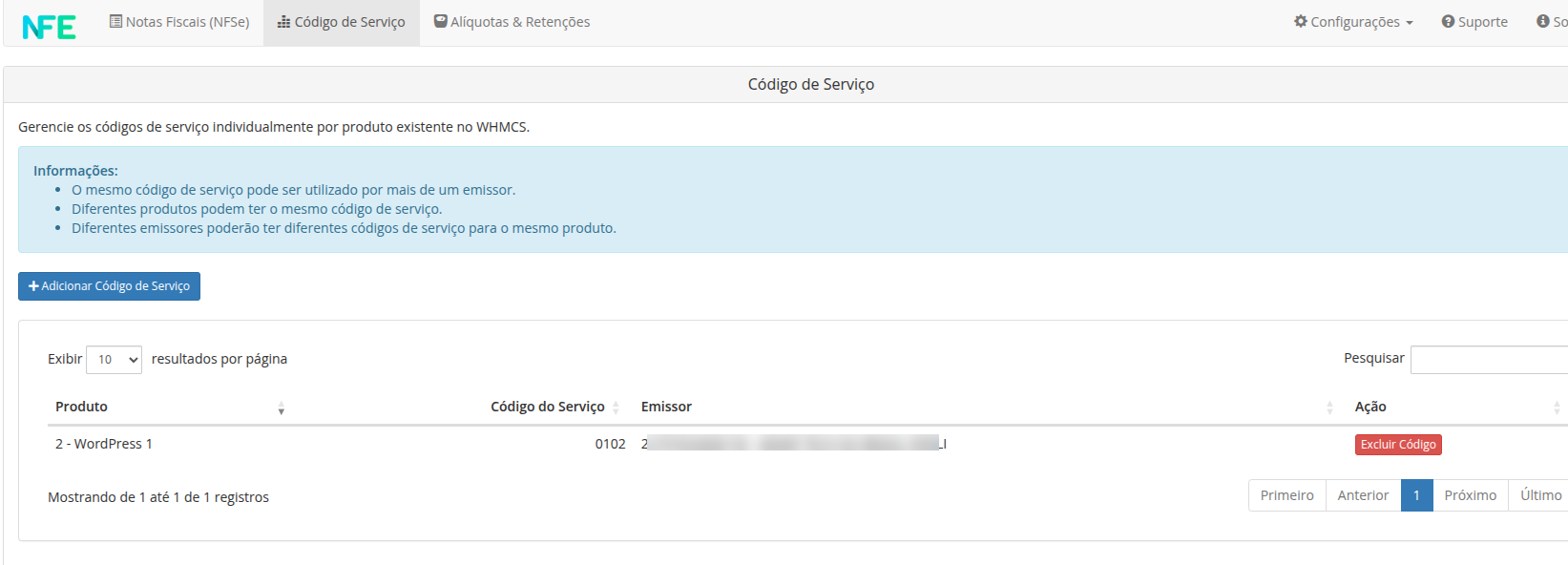 Para editar um código personalizado de um produto clique no botão Adicionar Código de Serviço e localize o produto/serviço desejado. Em seguida informe o novo código de serviço desejado e clique no botão Salvar Código.