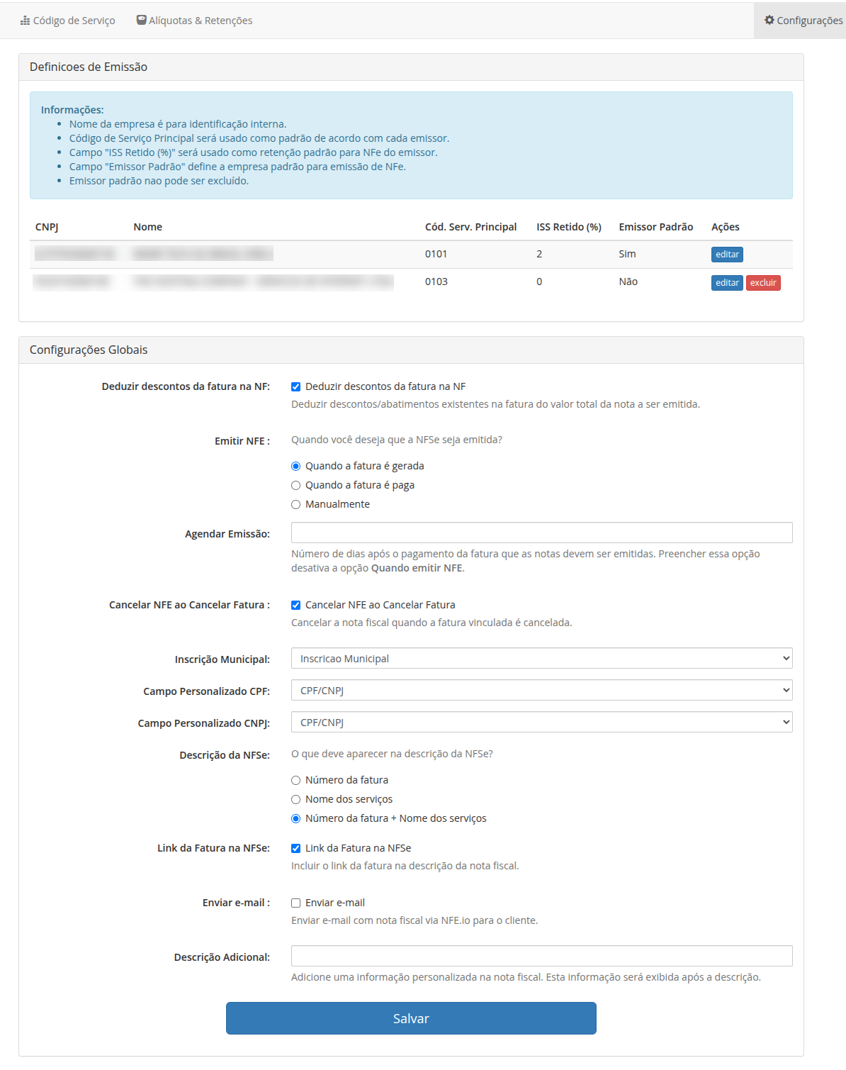 É possível configurar diferentes empresas a serem utilizados para emissão de notas fiscais pelo módulo, cada um com suas definições.